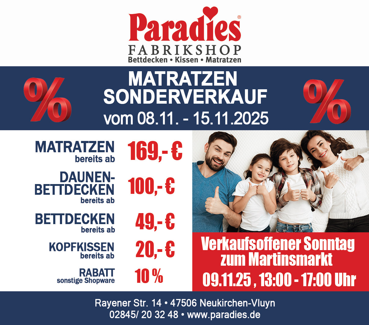 In unseren Fabrikverkaufsstellen bieten wir Ihnen die Möglichkeit, Paradies Produkte preisgünstig direkt ab Werk zu kaufen. Unser gut geschultes Verkaufspersonal steht Ihnen gerne mit Rat und Tat zur Seite und hilft Ihnen, ein Ihren Bedürfnissen entsprechendes Produkt zu finden. Alle zum Verkauf angebotenen Matratzenmodelle stehen Ihnen hier zum Probeliegen zur Verfügung.