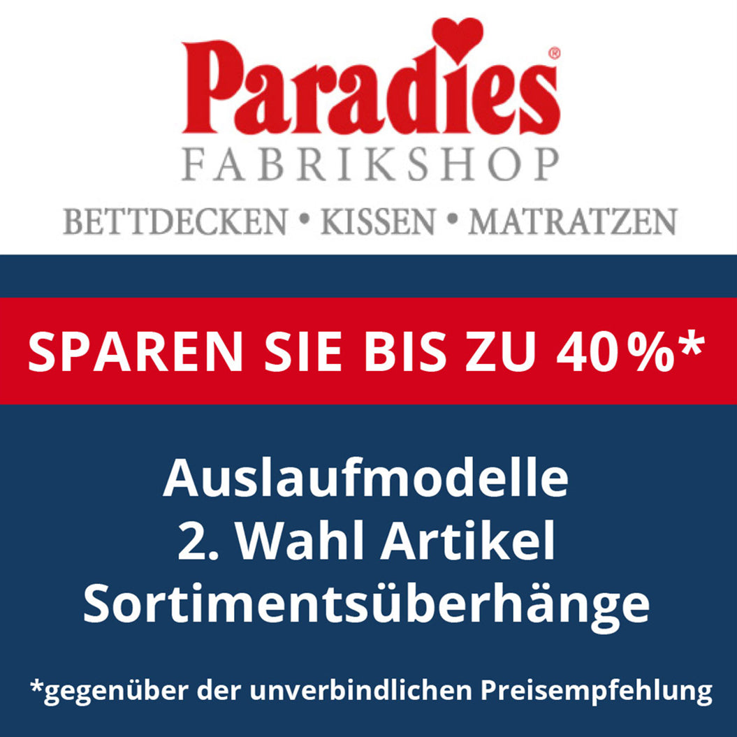 Die angebotenen Bettdecken, Kissen und Matratzen sind Sortimentsüberhänge oder Produkte aus nicht mehr aktuellen Kollektionen. Aktuelle Sortimentsware von Paradies finden Sie ausschließlich bei unseren Partnern im Handel – den Fachgeschäften und Fachmärkten, in hochwertigen Waren- und Möbelhäusern sowie in den Online-Shops unserer Handelspartner.